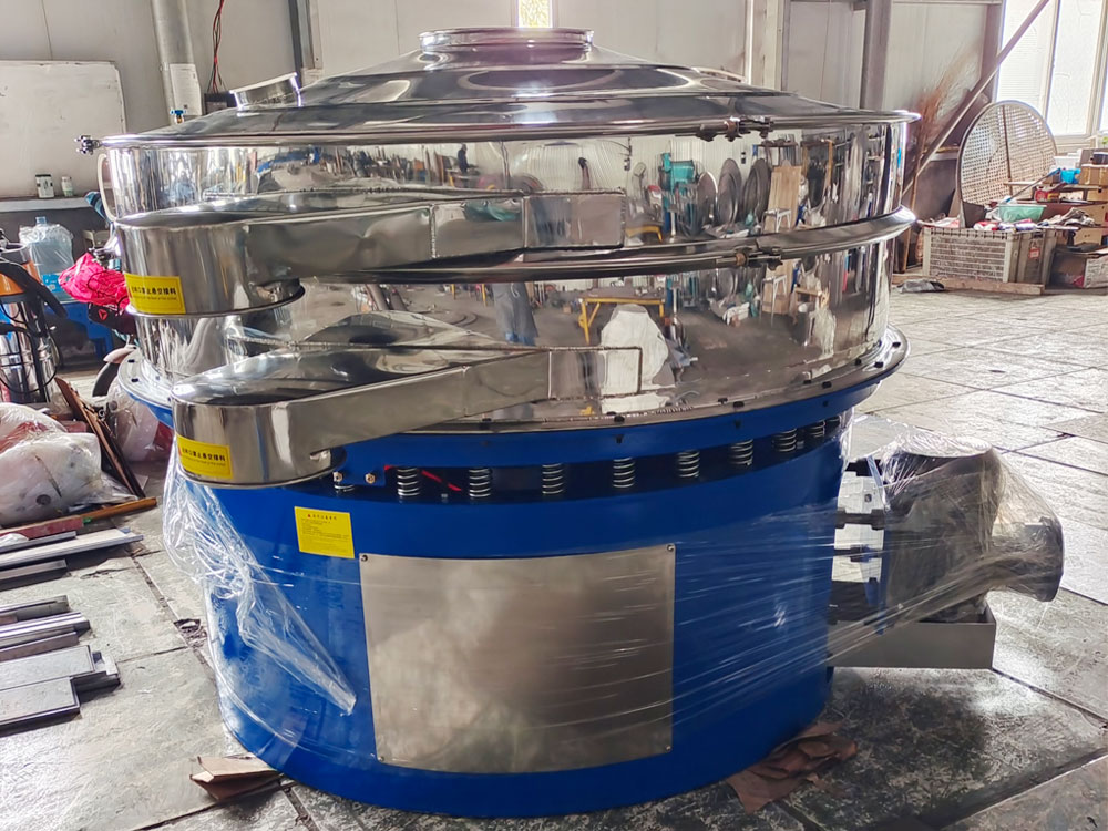 振动筛的筛分是依靠振动体两端的偏心块产生的激振力来实现的,上部偏心块的运动用来摇动机器,使物料在网面上由中心向外扩散;下部偏心块使网面上的物料产生垂直振动,上下偏心块的振动合成使物料在网面上产生特殊的三次元运动,上下偏心块相位角的改变,可以使振动性质发生变化,根据物料比重、干湿等情况,调整偏信块的相位角与配种比,实现精确的分级率和zui大的产量,达到满意的筛分、过滤效果。结构特点与优点:
